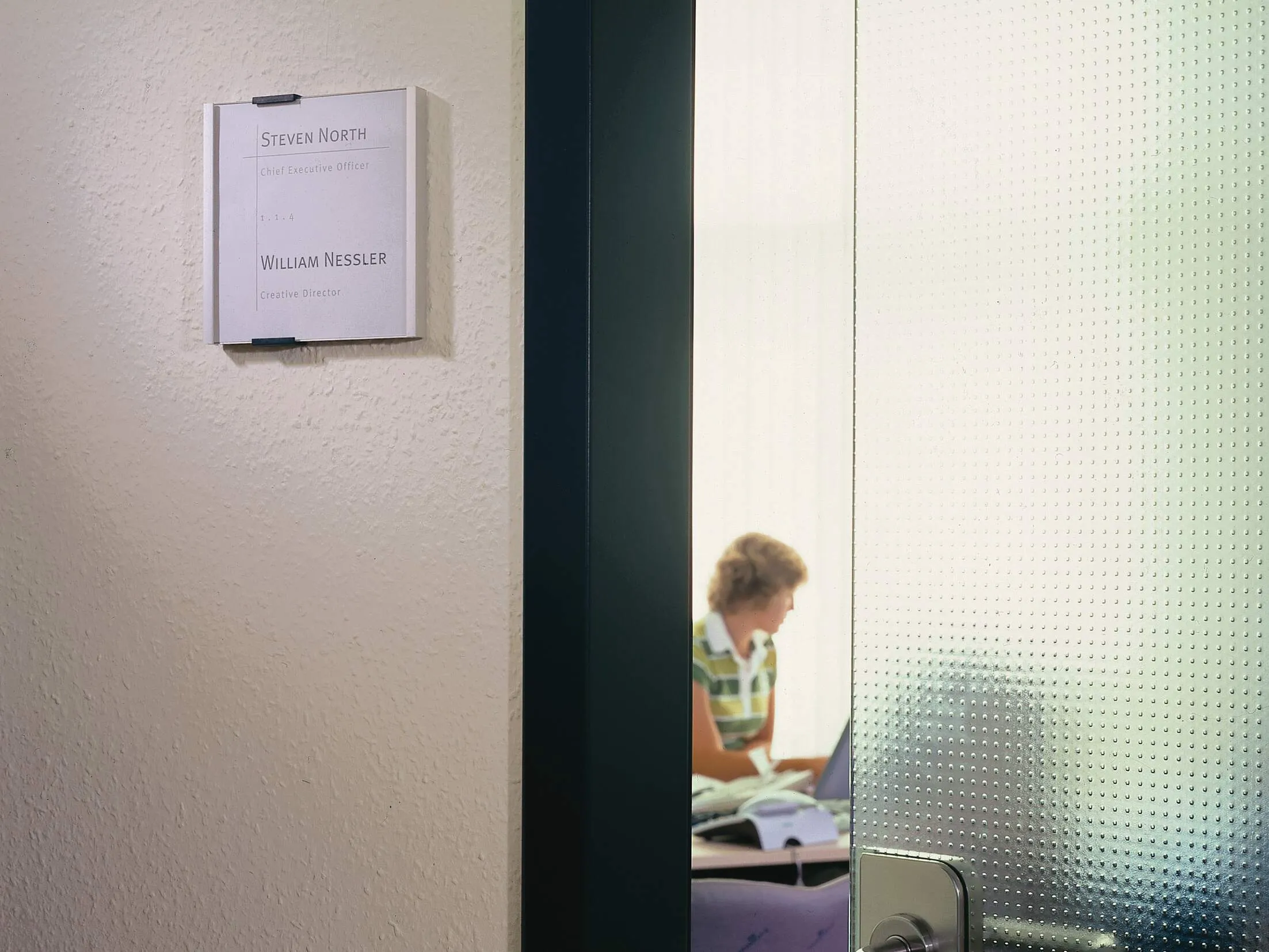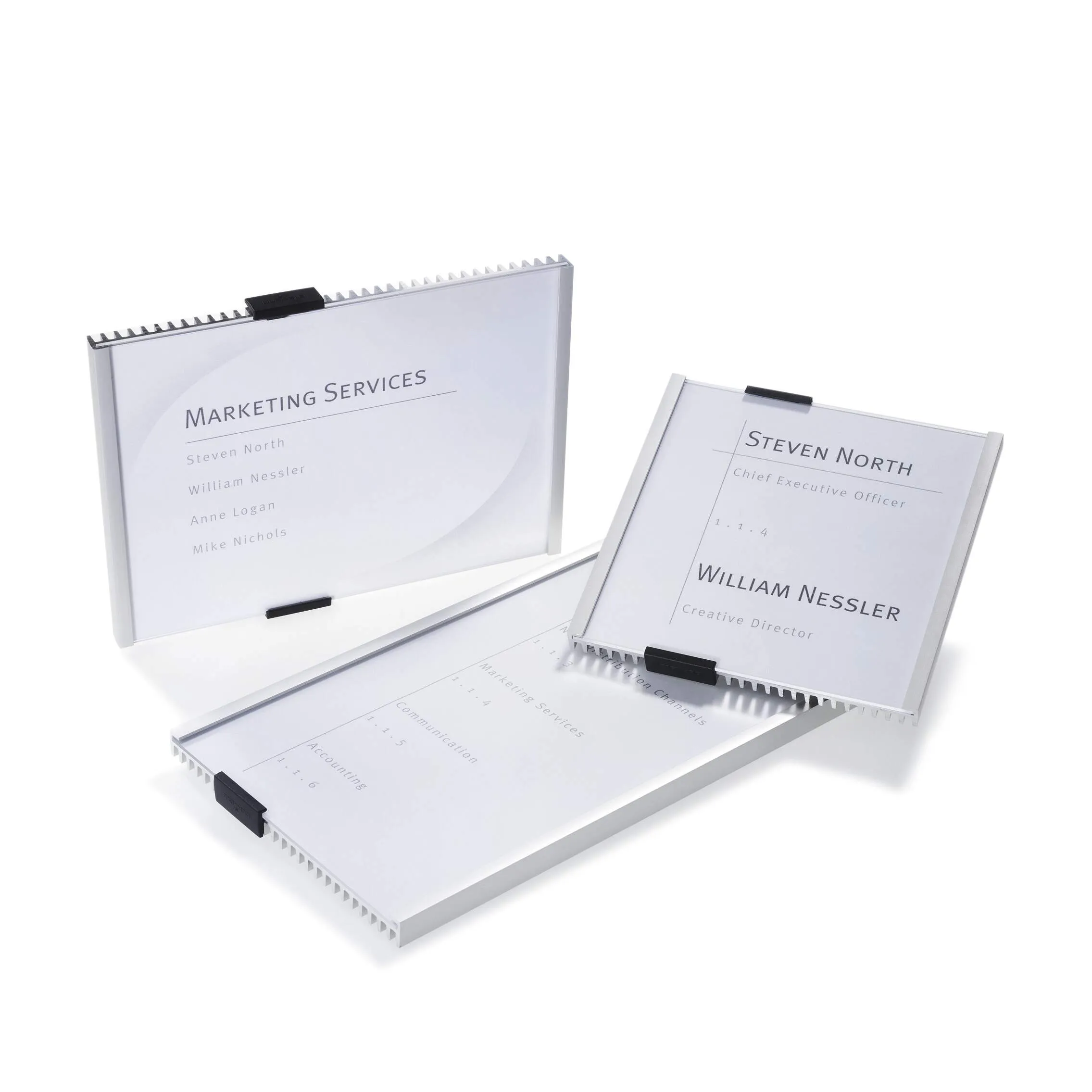 La gamme Info Sign de Durable offre une signalétique intérieure élégante et évolutive. Conçues en aluminium avec une façade de protection amovible en acrylique transparent antireflet, ces plaques d'affichage permettent d'identifier bureaux, salles de réunion, chambres d'hôtel ou espaces professionnels avec un rendu valorisant.
