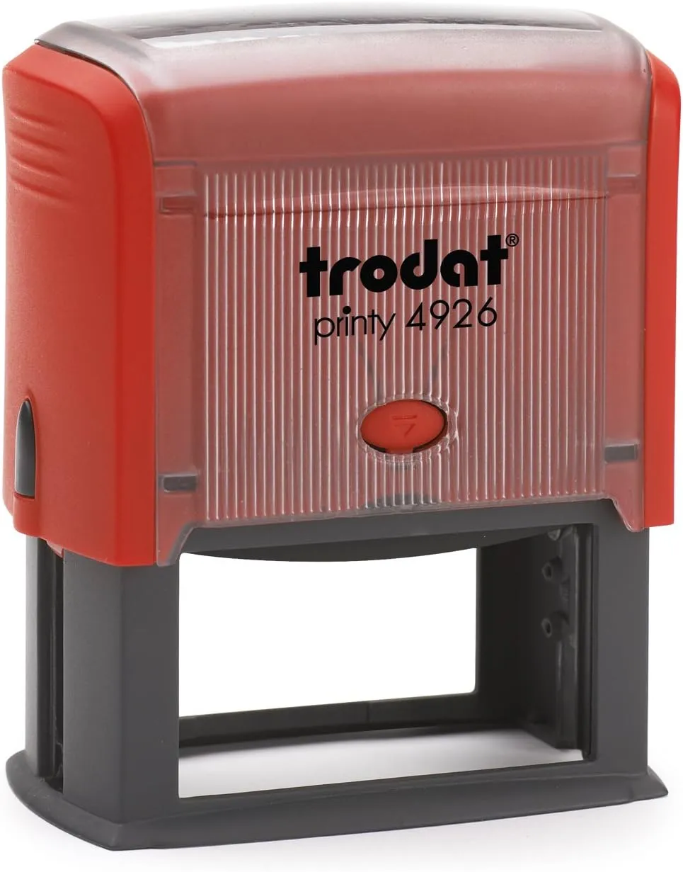 Le Trodat Printy 4926 offre une empreinte de 75 × 38 mm pour reproduire jusqu'à 8 lignes de texte — le format le plus capacitaire de la gamme Printy rectangulaire, idéal pour les coordonnées complètes avec logo, mentions légales et informations de contact détaillées.